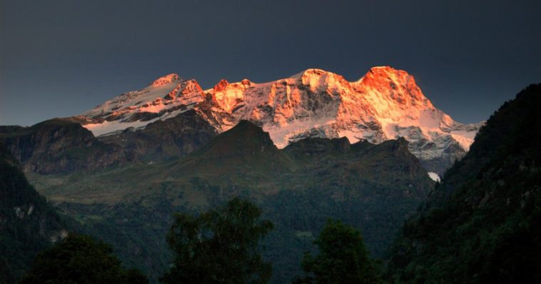Una vista del Monte Rosa illuminato nella sua parte sommitale.